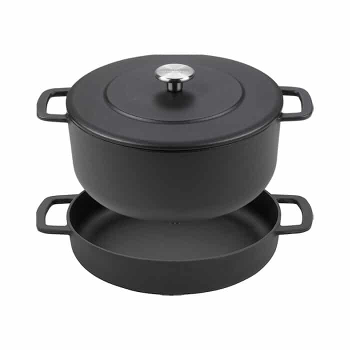 De Skillet + Dutch Oven black Set 28CM Combekk zijn pannen gemaakt van 100% gerecycled gietijzer.
