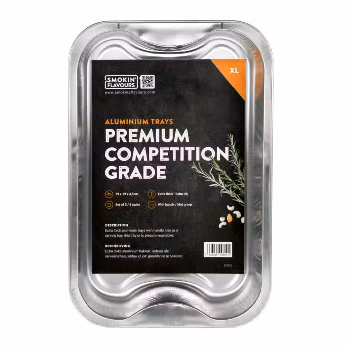 Dit zijn extra grote aluminium bakken van het merk Smokin’ Flavours. Ze worden verkocht in sets van vijf stuks.
