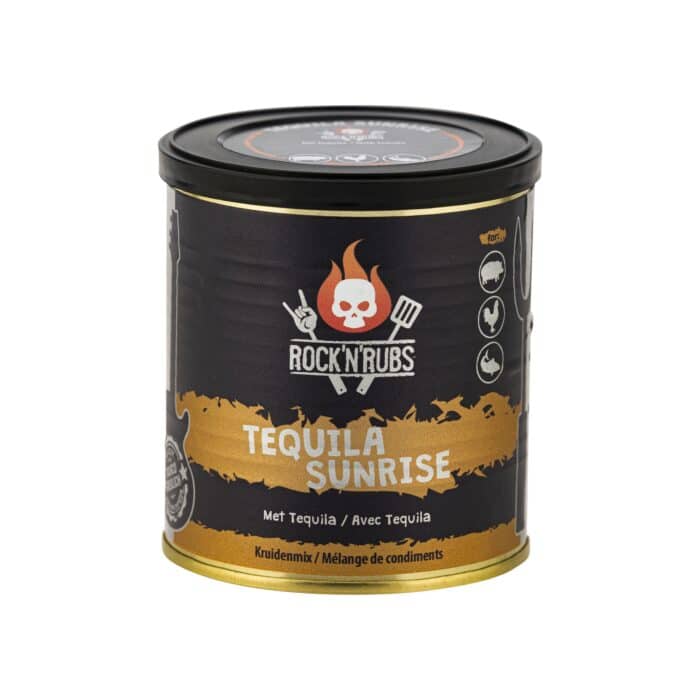 De Rock ‘n’ Rubs – Tequila sunrise bevat specerijen zoals zoete paprika, koriander, zwarte peper, witte peper, chili, komijn, en Spaanse peper. Het heeft ook zeezout, rietsuiker, uien, tequila, kruiden zoals oregano, rozemarijn, basilicum, knoflook, en sinaasappelschil olie.