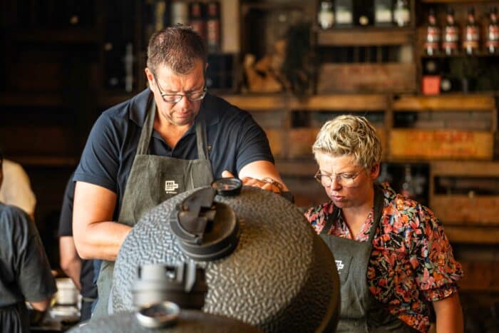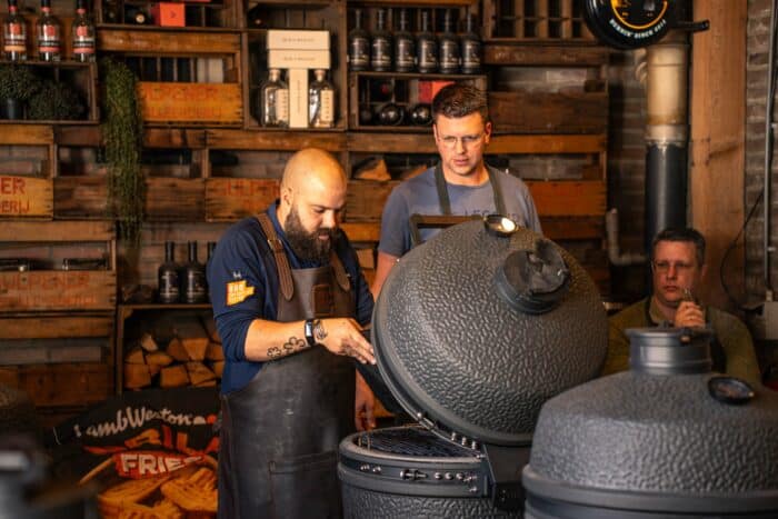 Per werkbank heb je de beschikking over een large kamado waarin je zelf alles gaat bereiden. Onze workshopruimte is gevuld met ofwel de Big Green Egg of The Bastard. Vaak gebruiken we extra BBQ’s in de workshopruimte om veel tegelijkertijd te doen. Heb je een ander merk of nog helemaal geen kamado? Geen probleem en je bent van harte welkom uiteraard! De technieken kan je zeker thuis ook toepassen.