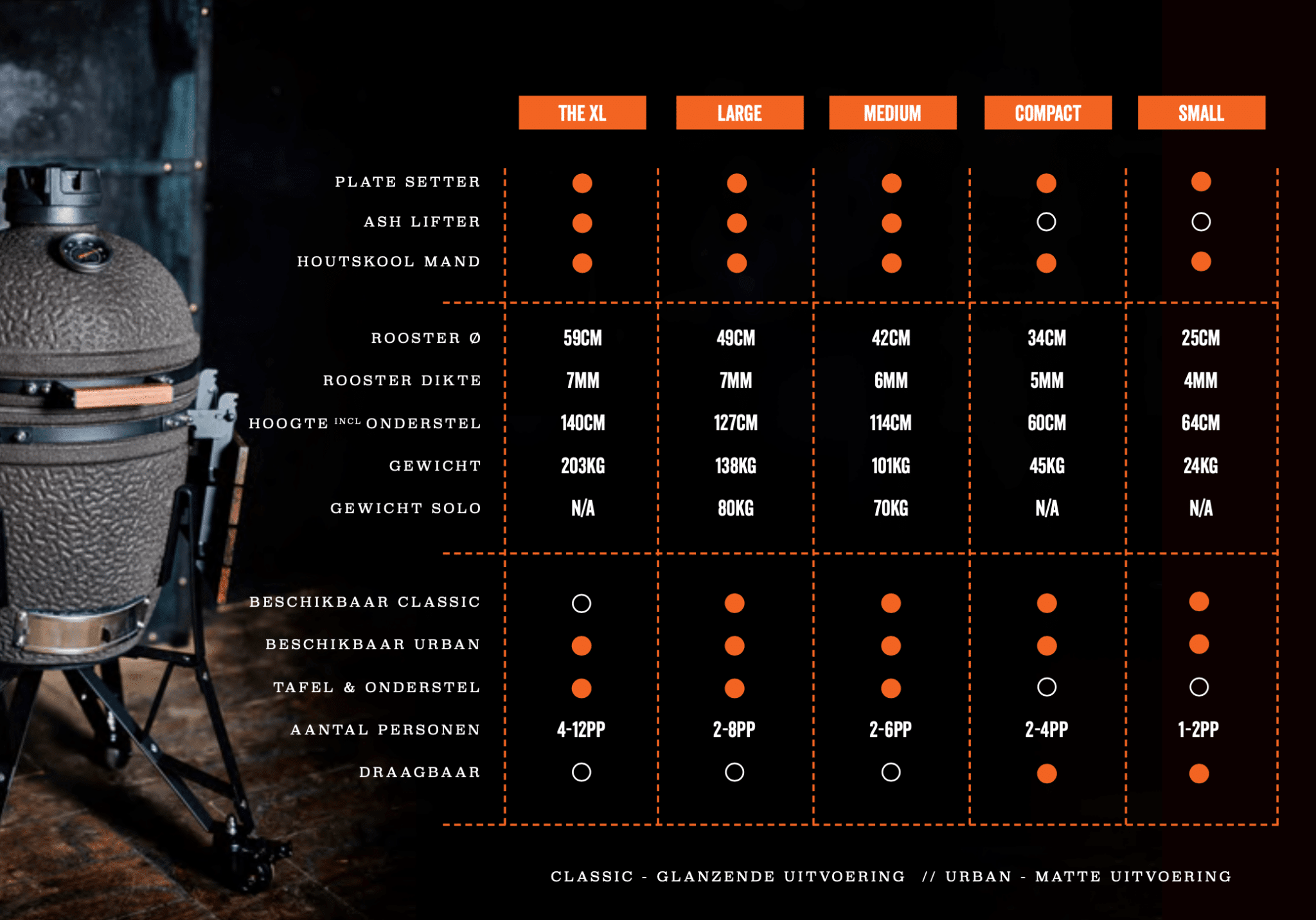 De range van modellen van Bastard is erg breed, voor iedere situatie is er wel een geschikte maat te vinden. De rooster diameter loopt van 25cm bij de small tot maar liefst 59cm bij de XL! De meeste mensen kiezen voor het large model omdat dit het meest veelzijdig is, voor 2 tot 6 personen kun je hier lekker op aan de slag en volwaardige gangen koken. Bijvoorbeeld vlees en groenten tegelijkertijd op het rooster. Uiteraard kun je er ook voor 10 personen op koken, dan ligt er gewoon een groot stuk vlees op en maak je de andere gerechten gewoon op een andere manier of moment.