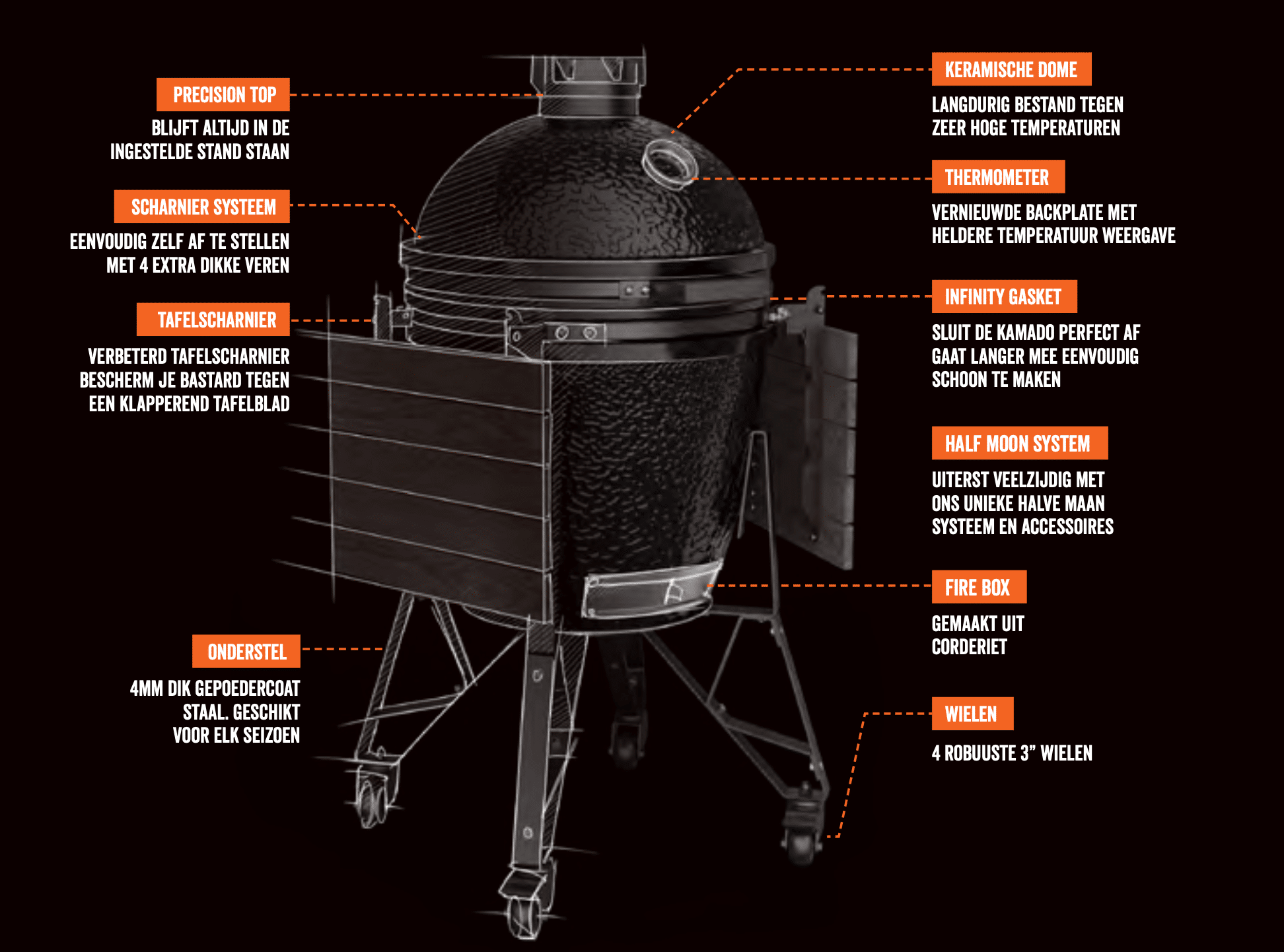 Een bastard wordt vrij compleet geleverd, standaard ben je al voorzien van een plate setter, wat fungeert als hitteschild en daarmee nodig bij alle indirecte bereidingen. Een ash lifter, dit is een as bak onderin de kamado waarmee je makkelijk as eruit haalt. En een houtskool mand waar de houtskool in gaat en wat het schoonmaken wel erg makkelijk maakt. De houtskool mand zorgt daarnaast voor een betere airflow binnen de kamado waardoor de temperatuur sneller reageert op jouw instellingen.