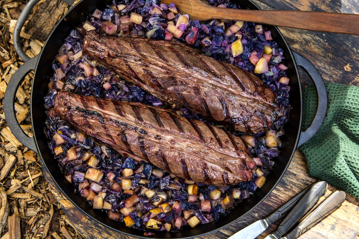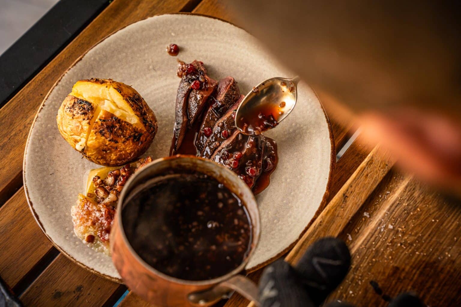 Met veenbessensaus en gevulde appel en gepofte aardappel
